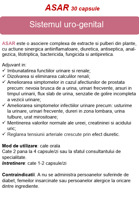 „Activitatea antiurolitică a extractului de Tribulus terrestris regăsit în Asar este atribuită proprietății de inhibare a GOX, ceea ce justifică potența citoprotectoare împotriva nucleării și creșterii cristalelor de oxalat de calciu, precum și împotriva leziunilor celulare produse de oxalați asupra celulelor epiteliale renale. Alți fitoconstituenți extrași din ingredientele produsului Asar ajută la creșterea forței de contracție, reducând volumul de urină reziduală la pacienții cu hipertrofie prostatică. Pacienții au arătat o scădere ulterioară a mărimii sonografice a prostatei și o îmbunătățire a debitmetriei.”