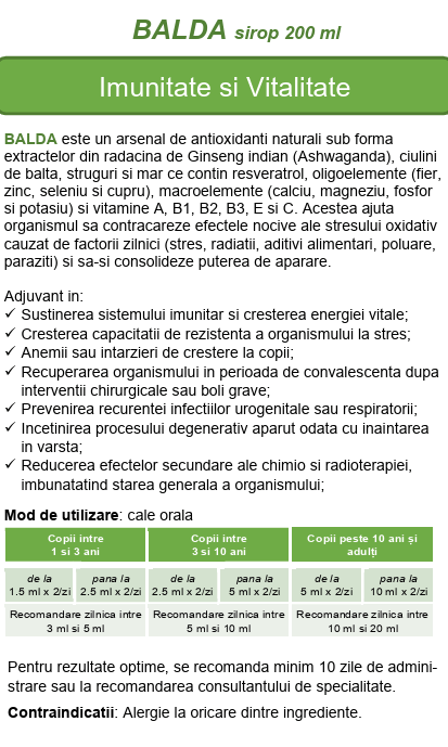 „Putem concluziona că terapia adjuvantă cu siropul Balda este neinvazivă, contribuind la eliminarea barierelor ce pot bloca capacitatea organismului de a se vindeca, cum ar fi: un proces inflamator, o imunitate scazută, o fatigabilitate severă sau o rezistență slabă a organismului la infecții și stres. În plus, prezintă un profil de siguranță înalt, putând fi asociat tratamentului alopat, cu efecte clinice favorabile mai ales în cresterea calității vieții și a stării de bine a pacientului.”