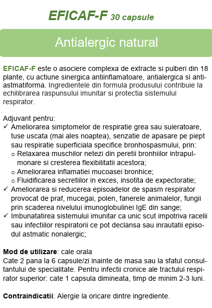 EFICAF-F este o asociere complexă de extracte şi pulberi din 18 plante, cu acţiune sinergică antiinflamatoare, antialergică și antiasmatiformă. Ingredientele din formula produsului contribuie la echilibrarea răspunsului imunitar și protecţia sistemului respirator.