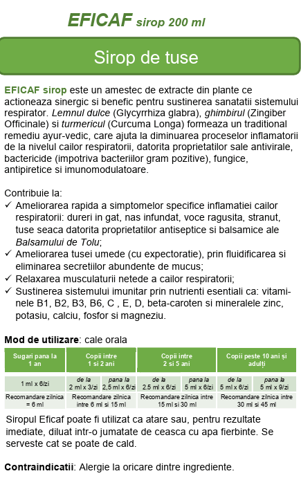 Siropul EFICAF este un amestec de extracte din plante ce acţionează sinergic și benefic pentru susţinerea sănătăţii sistemului respirator. Lemnul dulce (Glycyrrhiza glabra), ghimbirul (Zingiber officinale) și turmericul (Curcuma longa) din formula siropului ajută la diminuarea proceselor inflamatorii de la nivelul căilor respiratorii, datorită proprietăţilor sale antivirale, bactericide, fungice, antipiretice și imunostimulatoare. Elementele surpriză sunt: Balsamul de Tolu cu proprietăţi emoliente și demulcente și alcaloizii peptidici din extractul de Jujube (Zyzyphus jujuba) sursă bogată în vitamina C, cu efect antibacterian pentru bacteriile gram pozitive. Piper Longum se adaugă cu rolul creșterii biodisponibilității substanţelor din formula produsului.