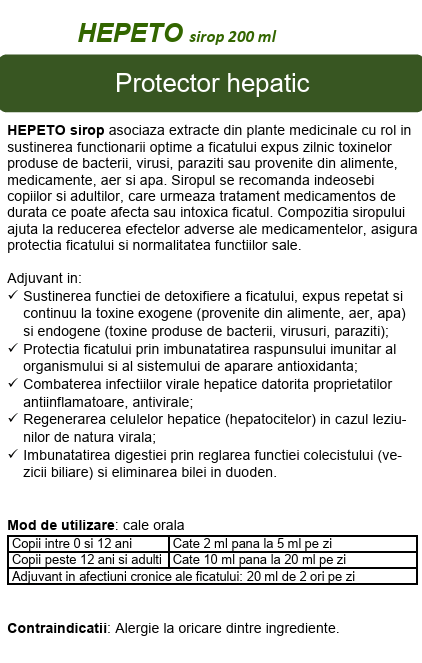 „Bilanțul biologic arată scăderea transaminazelor şi ameliorarea clinică a sugarilor cu hepatocitoliză, având totodată şi o rată mare de acceptabilitate din partea celor mici (gust plăcut de anason). Tratamentul cu Hepeto sirop hepatoprotector susține alimentația naturală, evoluția clinică fiind favorabilă, cu spor ponderal şi fără simptomatologie acută. De asemenea, se observă creşterea toleranței digestive a terapiei marțiale recomandată în cazurile de anemie cu deficit de fier.”