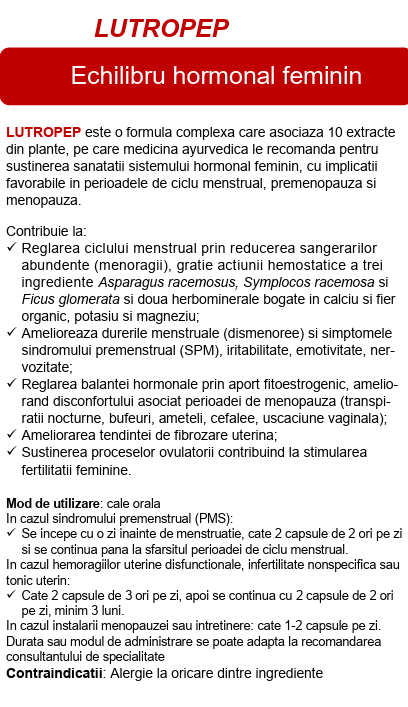 „Formula naturală Lutropep ajută la ameliorarea semnificativă a simptomelor supărătoare fizice, emoționale și comportamentale, care apar în săptămâna dinaintea CM. De asemenea, se observă normalizarea fluxului sanguin în timpul CM, reglarea ovulației, a fertilității și reglarea funcției tiroidiene.”