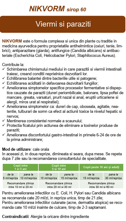 „Nikvorm contribuie la distrugerea parazitului și a formelor lui de rezistență, ouă, larve, chisturi. Rezultatele studiului observațional arată siguranță și eficiență la adulți, cât și pentru micii pacienți infestați cu parazitoze intestinale, începând cu vârsta de 1 an. Susținerea microorganismelor “prietenoase” comensale, defavorizând alterarea bacteriilor utile și dezvoltarea fungilor reprezintă un avantaj suplimentar al tratamentului fitoterapeutic.”